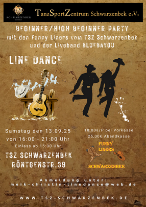 Die Funny Liners vom TSZ Schwarzenbek laden herzlich ein zur großen Linedance-Party für Beginner und High Beginner. Freut euch auf einen stimmungsvollen Nachmittag und Abend voller Musik, Tanz und guter Laune – begleitet von der Liveband BLUE BAYOU!