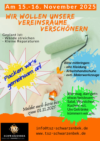 unsere Vereinsräume sollen ein bisschen frischen Glanz bekommen – und dafür brauchen wir euch! Am 15. und 16. November 2025 wollen wir gemeinsam die Wände streichen und kleine Reparaturen erledigen.