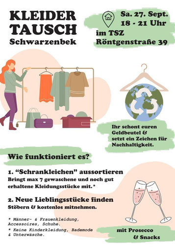 Du hast Kleidung, Schuhe oder Accessoires, die du nicht mehr trägst? Dann komm am Samstag, den 27.09.2025 um 18-21 Uhr zu unserem Kleidertausch ins Tanzsportzentrum in der Röntgenstraße 39 in Schwarzenbek.