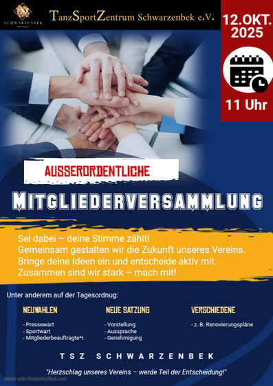 Wir treffen uns im TanzSportZentrum Schwarzenbek zu einer außerordentlichen Mitgliederversammlung.